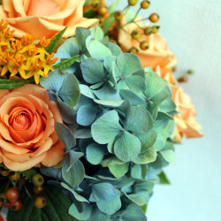 Piękna niebieska hortensja z zielonymi przebarwieniami wyglądała jak z innej epoki, w połączeniu z intensywnie pomarańczową tojeścią i morelowymi różami. Owoce róży drobnokwiatowej świetnie wpasowały się kolorystycznie i nadały lekko jesiennego klimatu.