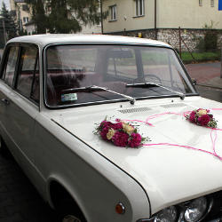 Całość zamówienia uzupełniła dekoracja stylowego Fiata 125p. Na masce pojawiły się miłosne, fuksjowe serca z ratanu z mini kompozycjami z goździków. A przy każdej klamce pojawiło się serduszko z goździkiem.