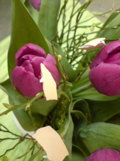 Świąteczny bukiet z fioletowych tulipanów, z pędami borówki czernicy i skorupkami jajek.