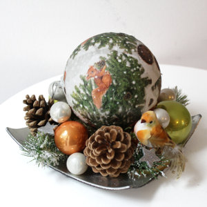 Tydzień temu otrzymałam trzy bombki z decoupage z życzeniem zrobienia z nimi stroików. Bombka z leśnymi zwierzątkami była dla dzieci, więc stroik był z radosnymi pomarańczowymi bombkami, brokatowymi gwiazdkami, a całości dopełnił maleńki ptaszek.