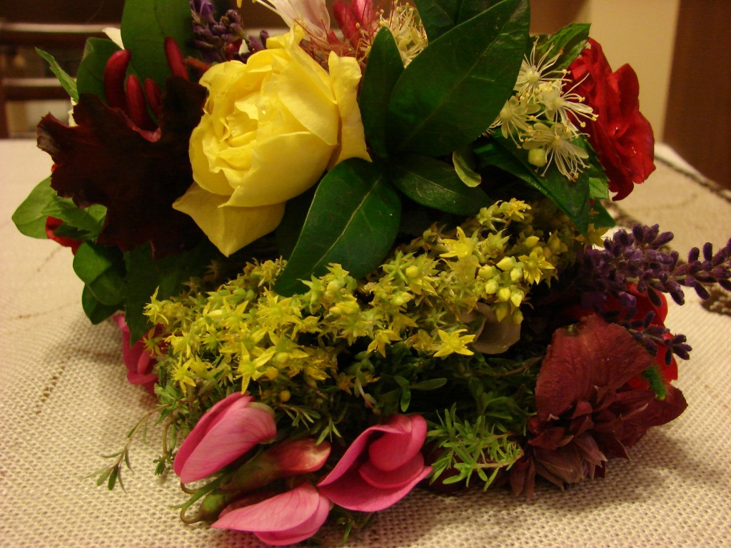 W moim rodzinnym domu również utrzymała się ta tradycja. I wczoraj razem z moją mamą stworzyłyśmy trzy śliczne wianki. Pierwszy zrobiony jest z samego rozchodnika (Sedum ), natomiast dwa pozostałe z ziół: macierzanki, (Thymus ) lawendy ( Lavandulla ), mięty( Mentha ) oraz kwiatów aktualnie kwitnących w naszym ogrodzie.