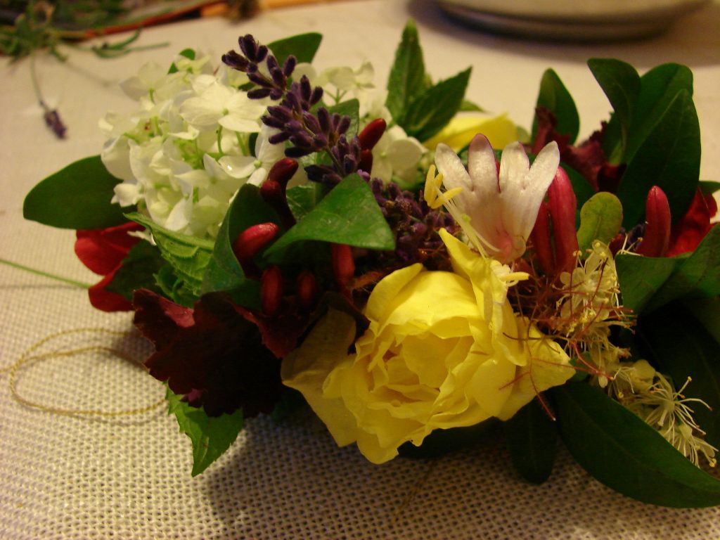 Wianki zostały wykonane metodą stosowaną jeszcze przez moja babcię. Pojedyncze kwiaty lub listki wiązałyśmy cienkim sznurkiem. Na zmianę dokładałyśmy kwiaty, liście i zioła, a po uzyskaniu odpowiedniej długości związałyśmy dwa końce.