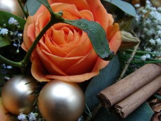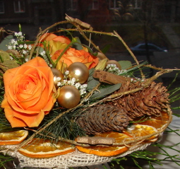 Moja propozycja to bukiet z różami (Rosa ) na kryzie z suszonych pomarańczy. Zielone cieniutkie pędy to borówka czarna (Vaccinium myrtillus ), srebrzyste liście to eukaliptus (Eucaliptus ) oraz jemioła pospolita (Viscum album ). Ponad to w bukiecie znalazły się gałązki sosny zwyczajnej (Pinus sylvestris ) oraz szyszki świerku pospolitego (Piceaabies). Suszone elementy to laski cynamonu (Cinnamomum ), pędy widłaka (Lycopodium ) oraz owoce ketmii (Hibiscus).