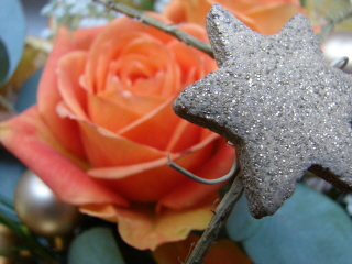 Świąteczny klimat tworzą złote bombki i gwiazdki z masy solnej. Natomiast zimowego charakteru kompozycji nadały pędy gipsówki (Gypsophila ), które skojarzyły mi się ze śniegiem :)