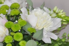 Kompozycja miała być w neutralnej kolorystyce, bo koleżanka do ostatniej chwili nie była zdecydowana w jakiej sukni wystąpi, a przecież bukiet musi do niej pasować ;) Biel i zieleń wydała mi się dość uniwersalna i jak najbardziej pasująca do okazji.