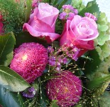 W mojej kompozycji znalazły się róże odmiany "Deep water", typowo jesienne kwiaty czyli astry oraz hortensja. Dodatki to zatrwian, rdest plamisty, proso, trawa niedźwiedzia, liście aspidistry oraz asparagus modrzewiowy.