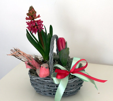 Proste wiosenne aranżacje z hiacyntów, tulipanów i krokusów w uroczych koszyczkach — kilka pomysłów na wiosnę w domu.