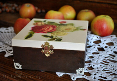 Ręcznie robione drewniane ozdoby w technice decoupage — skrzyneczki, herbaciaki i lusterka od Dekombinacji, dostępne w Takich Kwiatkach.