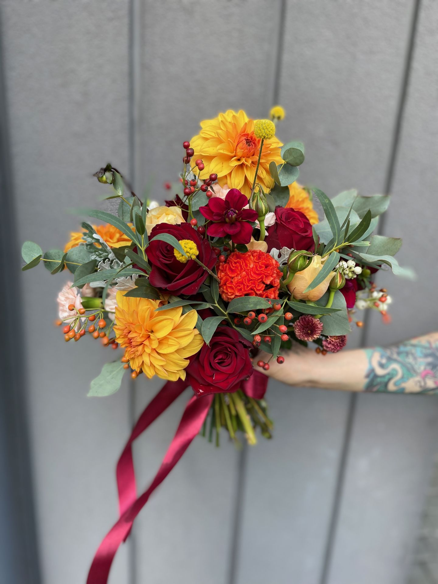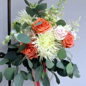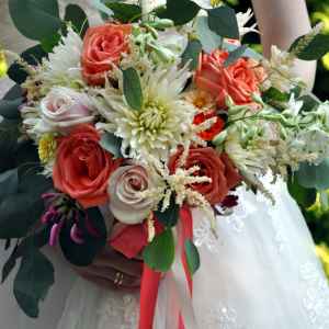 Pomarańczowe bukiety ślubne- latem z pięknymi różami lub ogrodowymi cyniami, jesienią z miechunką. Energetyczne lub bardziej zgaszone. Radosne i oryginalne. Kojarzone z optymizmem i ciepłem. Pomarańczowy bukiet ślubny z pewnością przyciąga wzrok- już sam pojedynczy akcent idealnie kontrastuje z większością delikatniejszych barw. Pomarańczowy może pojawić się również jako pastelowy, zgaszony odcień. W otoczeniu szarych liści, nie musi wcale być krzykliwą barwą.